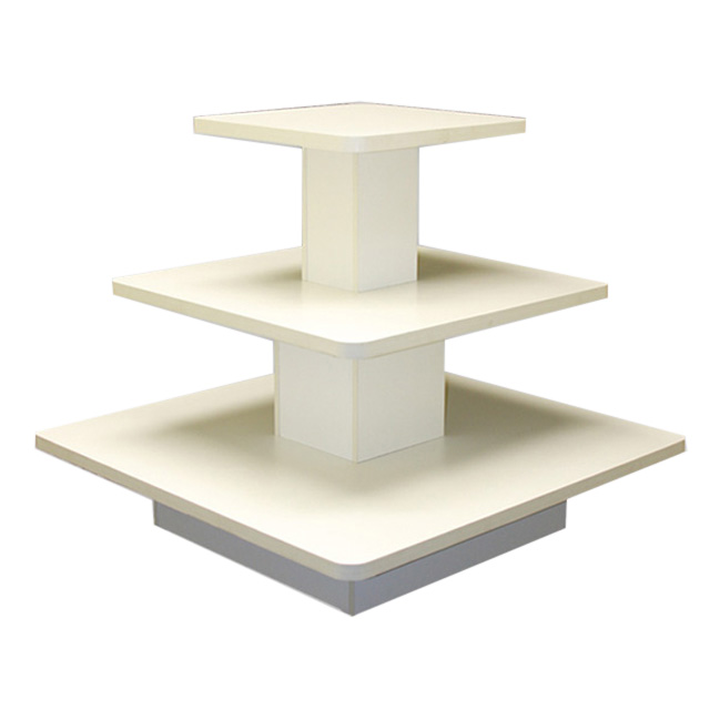 If you are short on space, and need a place to display your product or folded garments, then this DJE Store Fixtures display table merchandiser is for you. Its square shaped, three tier design provides an adequate amount of easily accessible display space, while its durable melamine finish completes the look making this table a great addition to any retail store.